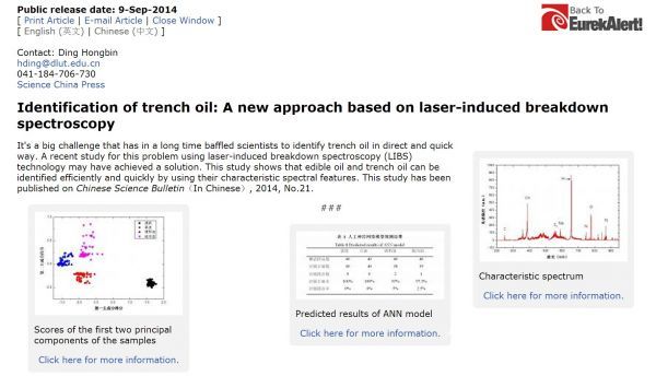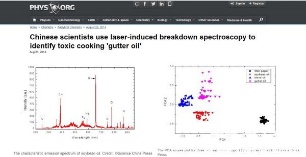 该研究成果以学术论文发表于中国科学院杂志社《科学通报》上,成为该期杂志的封面文章,引起了国内外同行的广泛关注,并在近日第八届国际激光诱导击穿光谱会议上被会议主席作为亮点引用。另外该成果被美国科学促进会(AAAS)的主流媒体新闻EurekAlert!以“Chinese scientists use laser-induced breakdown spectroscopy to identify toxic cooking 'gutter oil'”为题在物理学家组织网特别报道并被广泛转载,物理学家网主要报道来自全球各大研究机构的物理创新研究成果以及重要科学和重大技术前沿突破。此前,相关研究成果已获发明专利授权(专利号:ZL 201110404691),国际著名仪器设备制造商美国TSI公司和法国iVEA公司以及国内深圳和大连等高科技公司均希望转让或共同开发该技术。