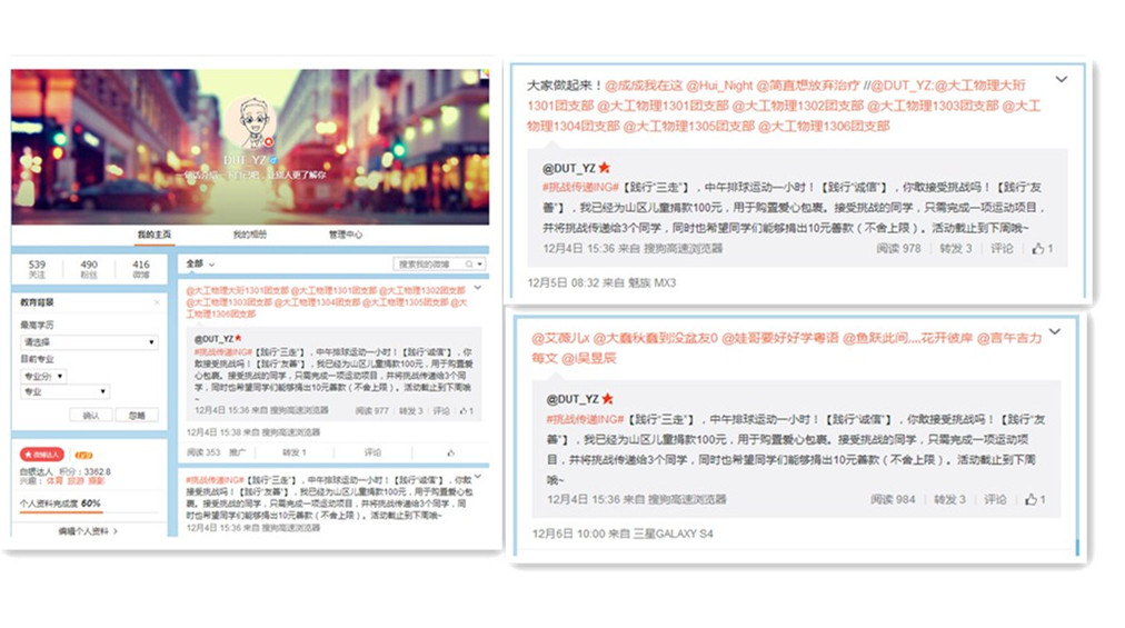 考试月日益临近,学院学生会向全院学生发起“诚信应考,正直做人”倡议,认真准备复习、诚信参与考试,不作弊、不违纪;借鉴公益爱心传递“冰桶挑战”的成功方式,11月末,学院在学生中发起了“诚信挑战”活动,通过朋友圈传递,每位同学向三位同学发起挑战,接受挑战的同学完成一项运动挑战,无法完成挑战的同学,向山区儿童捐款10元。