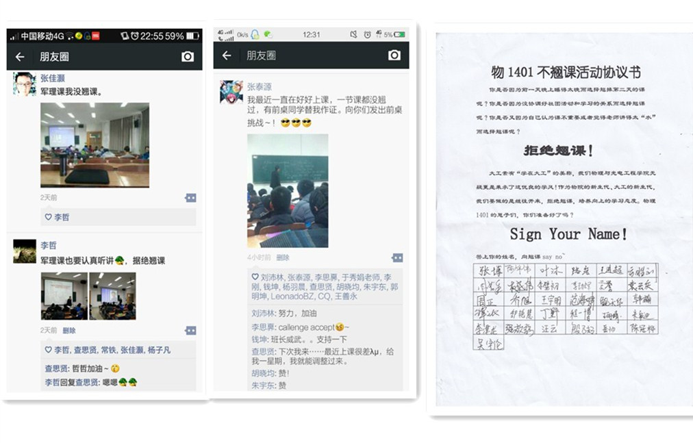 在学生中发起“不翘课活动倡议”活动,微信点名、相互督促,倡导从我做起,从身边小事做起,不翘课,做一个敬业的大学生;开展优良学风建设立项,发挥学风建设在人才培养工作中的重要作用,促进学生全面成长成才,推进班级学风常态化建设;开展“明星寝室”评选,搭建宿舍建设、班级建设的有效载体,发挥寝室育人功能;继续总结并不断完善学院“无手机课堂”建设经验,帮助学生培养自制力,摆脱“手机依赖”,提升自我管理能力,不做“低头族”,提高听课效率,推进学风建设。