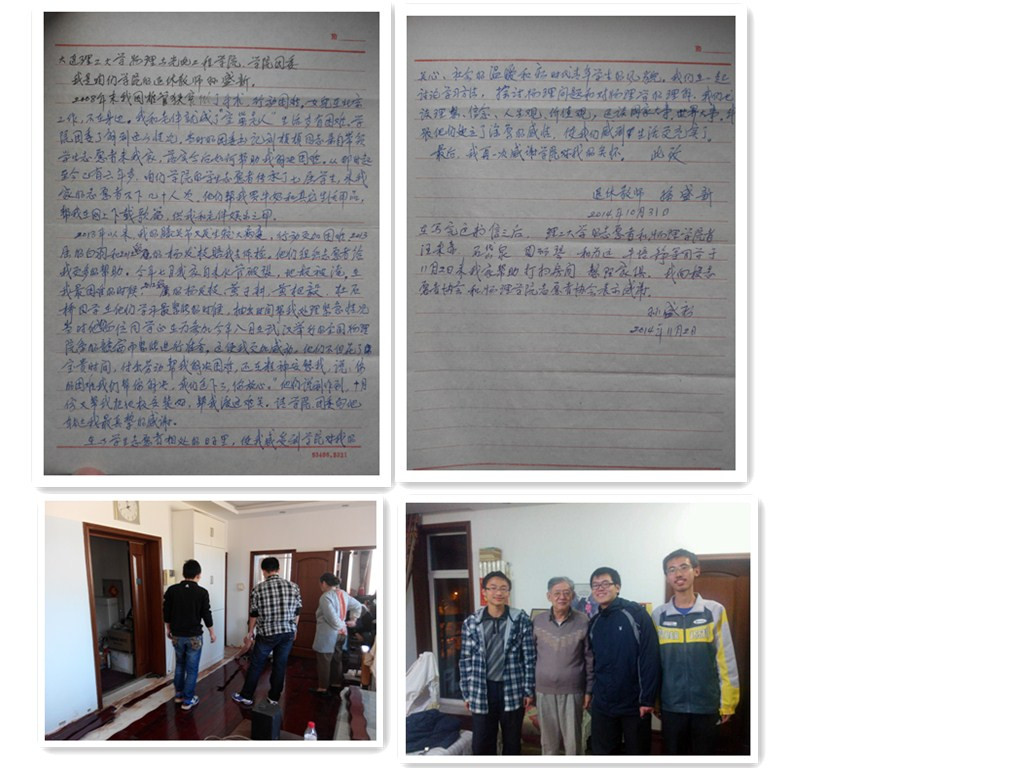 学院组织了本科生志愿服务团队,为退休教师、幼儿园小朋友等群体提供志愿服务活动,彰显当代大学生风采,培养学生志愿服务意识,践行“友善”价值观。自2008年起,学院退休教师陈芳培、孙盛新一直是本科生志愿服务团队的“情暖夕阳”活动长期服务对象,孙盛新老师给这只志愿服务团队写来一封热情洋溢的感谢信,让参与服务的志愿者倍感温暖。在周末,经常能看到学生志愿者担任“临时教师”和“临时导游”,带着一群可爱的小天使畅游大工校园,在教学楼、图书馆感受学习氛围,在基础物理实验室进行自然科学演示演示。养老院、儿童村探访,农民工子女义务家教,志愿者们用志愿行动奉献社会,用爱心奉献友善理念。