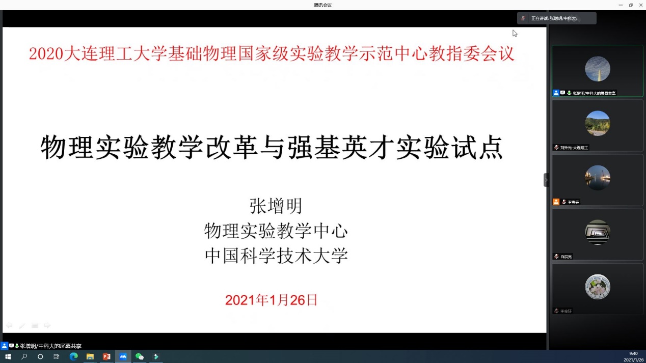 2020年1月26日,基础物理国家级实验教学示范中心(大连理工大学)教学指导委员会2020年年会通过腾讯会议的方式在线上召开。中心教学指导委员会主任、中国科技大学张增明教授、中心教学指导委员会委员华中科技大学熊永红教授、山东大学徐建强教授、东北师范大学李金环教授、大连理工大学余虹教授、大连理工大学李雪春教授以及实验中心的全体教师参加了会议。我校教务处副处长徐立昕教授、华体会(中国)副院长于长水教授出席会议。