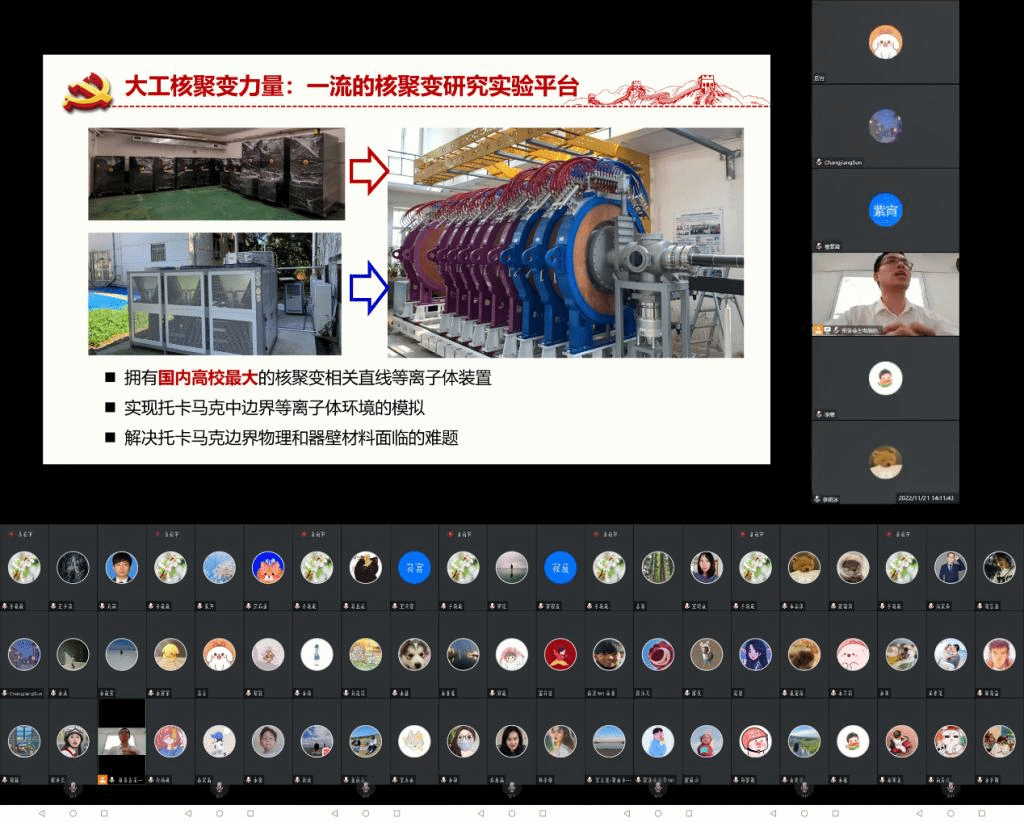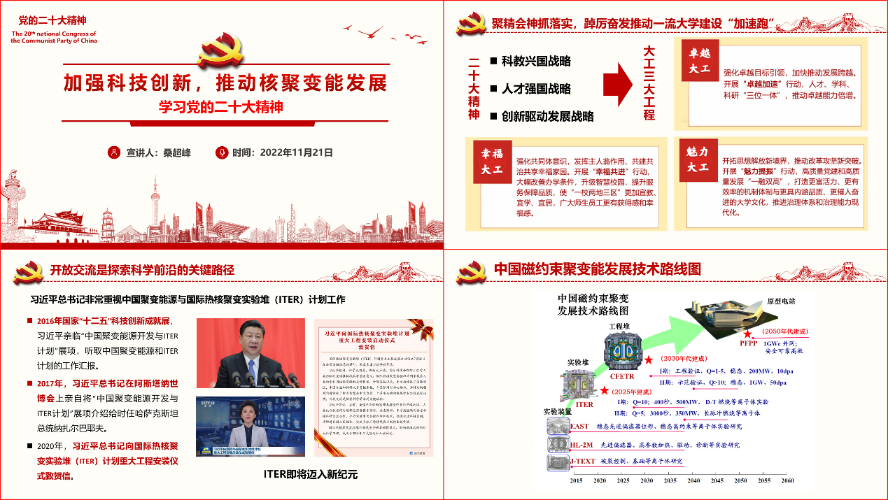 本次专题报告活动通过线上线下结合的方式开展,覆盖华体会(中国)全体师生党员。学院领导班子成员、党委委员、各党支部书记现场参加,学院党委书记王正汹主持活动并讲话,表示大科学计划是人类开拓知识前沿、探索未知世界和解决重大全球性问题的重要手段,我们在借鉴ITER经验的基础上,提出牵头组织国际核聚变示范堆计划方案建议,并面向能源需求谋划我国磁约束核聚变能发展战略及路线图,勉励师生党员将党的二十大精神学到深处、落到实处,心怀高远志向,做好本职工作,凝聚“大工力量”,奋进时代征程。