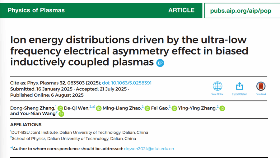 近日,我校中白学院2022级本科生张东升在偏压感性耦合等离子体离子能量调控的研究工作被国际等离子体物理领域主流期刊Phys. Plasma发表,并被编辑选为Editors’ Pick, 在杂志主页专栏刊载。论文题目为 “Ion energy distributions driven by the ultra-low frequency electrical asymmetry effect in biased inductively coupled plasmas”,其中张东升为第一作者;华体会(中国)的温德奇教授为通讯作者;华体会(中国)赵明亮博士后、高飞教授、张莹莹高级工程师和王友年教授为共同作者。