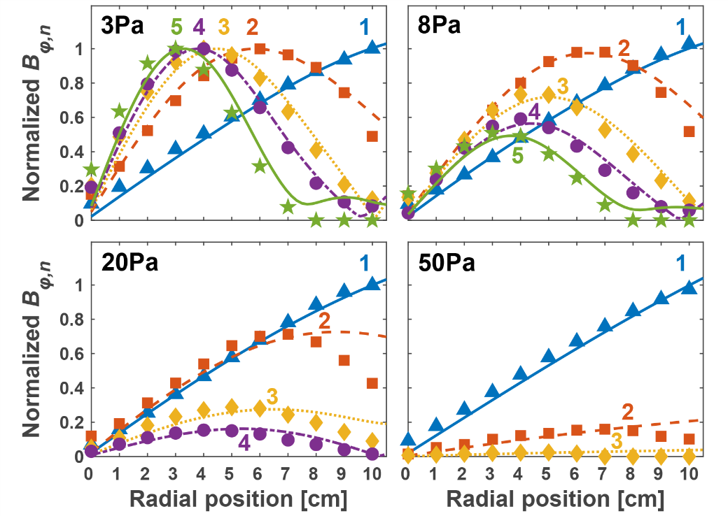 图1 不同气压下的甚高频100 MHz容性耦合Ar等离子体中,前五次谐波磁场的径向分布。图中符号代表实验结果,线代表模拟结果。
