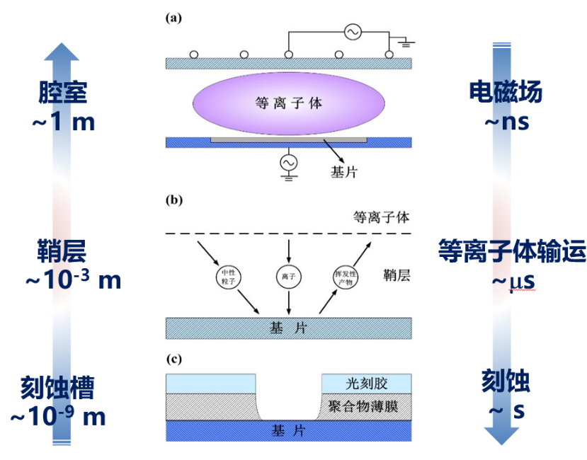 等离子体放电过程是极其复杂的,受到多种外界参数的控制,如电源功率与频率、气体成分与压强、腔室尺寸及材料属性等。此外,等离子体系统还包含了多空间尺度和多时间尺度的变化,以及多物理化学场的耦合过程。例如等离子体、鞘层、表面微槽等空间特征尺度相差10个量级;电磁场、带电粒子、中性气体及化学反应等时间特征尺度相差9个量级。如此复杂的等离子体工艺环境,给物理建模和数值仿真都带来了巨大的挑战。