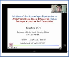 8月17日上午,应华体会(中国)原子与分子物理学科王高仁副教授邀请,中国人民大学物理系张芃教授为学院师生做了题为“Solutions of the Schrödinger Equation for an Anisotropic Dipole-Dipole Interaction Plus an Isotropic Attractive 1/r6 Interaction”的学术报告。赵纪军院长、于长水副院长、韩永昌副院长、丛书林教授、周思研究员、程传辉和郭宇副教授等60多位教师与研究生在线参加了学术报告会。