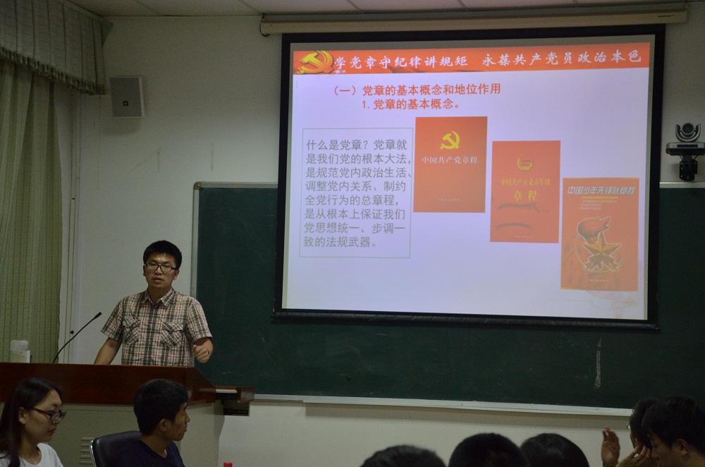 随后,研究生党总支书记韩道满同志结合自身的学习经历,为大家解读党章党规。韩道满同志从党章的基本概念和地位作用、学习贯彻党章的重要现实意义和坚决贯彻执行党章,切实增强党的纪律意识三个方面带领大家进行党章的学习。