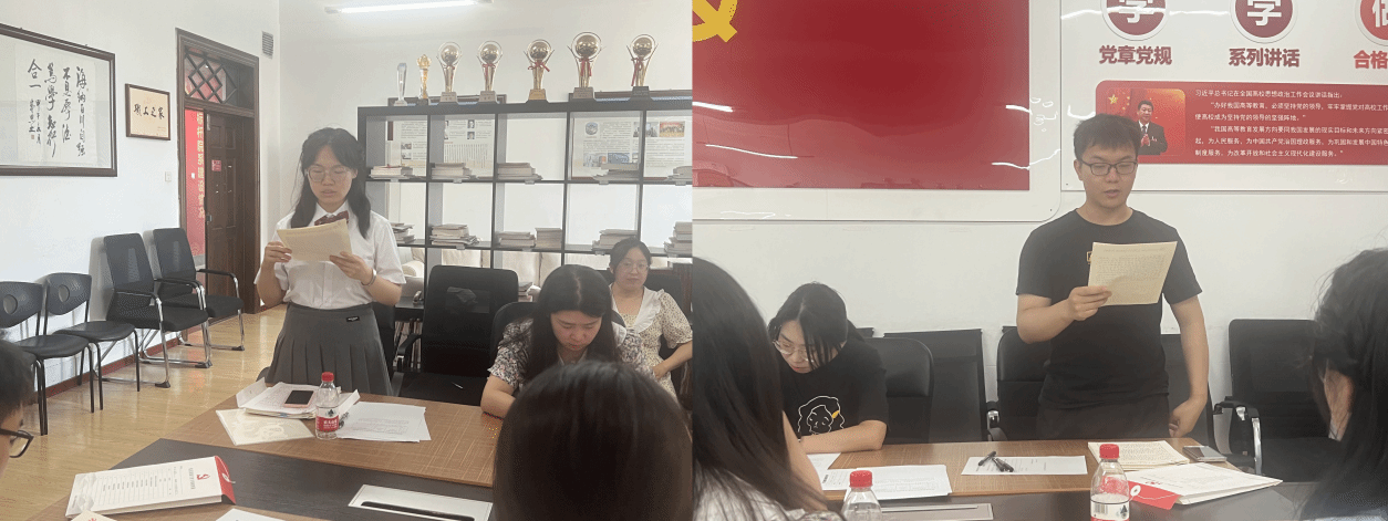 会议第二项,对预备党员杨祎嘉同志和何世文同志的转正事宜进行讨论。首先,由杨祎嘉同志和何世文同志依次宣读转正申请书,汇报自己在预备考察期内的思想、学习和生活等方面的表现情况。接下来,杨祎嘉同志的培养人陈永睿同志和韩钰芬同志分别对其在预备期内的表现给予了肯定;何世文同志的培养人陈永睿同志和辛璇璇同志对其在预备期内的各方面表现情况进行客观点评,并对其综合表现表示认可。经全体参会党员和群众积极讨论和评议,最终通过无记名投票方式进行表决,表决结果为一致同意两位同志按期转为中共正式党员。两位同志表示,他们会继续向优秀的党员同志学习,争取更大的进步。