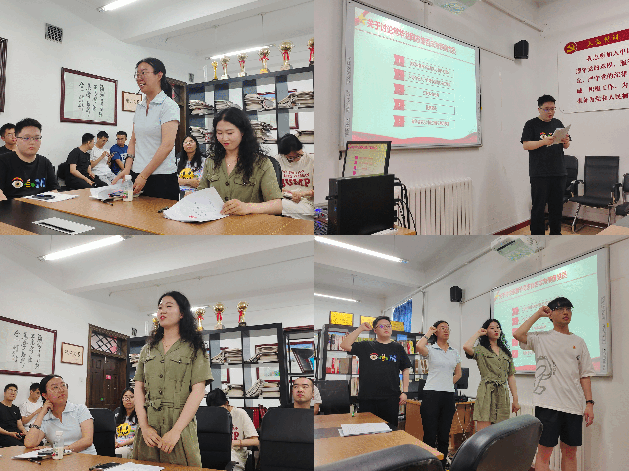 会议第二阶段,对郭冰琦、常华溢、张瀚予三名发展对象的入党事宜进行讨论。首先三名发展对象依次汇报对党的认识、入党动机及个人在思想、学习、科研等方面的表现,并宣读入党志愿书,表达加入党组织的坚定决心。随后,入党介绍人分别介绍发展对象的培养考察情况,充分肯定其政治素养、科研能力与奉献精神,一致同意接收其为中共预备党员,高子豪同志代表支委会汇报发展对象的政治审查结果。之后,与会党员以无记名投票方式进行表决,一致同意接收三名同志为中共预备党员。最后三位同志对表决情况表明态度,分别对党组织的培养表达感谢,承诺将以党员标准严格要求自己,在科研创新与服务群众中发挥先锋模范作用,并在党支部书记高子豪同志的带领下进行入党宣誓。