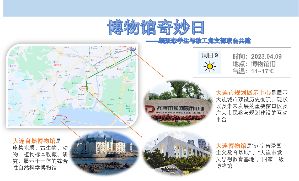 为深入学习宣传贯彻党的二十大精神和学校第十四次党代会精神,积极推进并落实“一融双高”建设,加强支部成员的党性修养,硕博凝聚态第一、第二、第三学生党支部联合凝聚态与理论物理教工党支部于2023年4月9日联合举办“融合有你我,加速向未来”系列党日活动之“博物馆奇妙日”活动。本次党日活动组织师生党员走进大连博物馆、大连市规划展示中心以及大连自然博物馆,踏寻红色足迹、重温红色记忆。