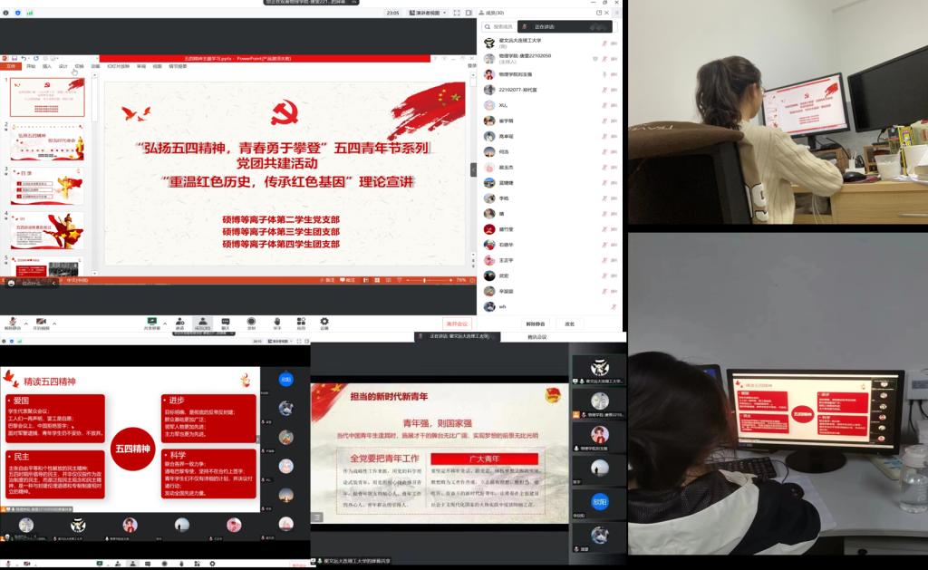 活动一:重温红色历史,传承红色基因。为深化青年学生们对五四精神和中国共产主义青年团的了解,5月6日,硕博等离子体第二学生党支部、硕博等离子体第三、第四学生团支部一起开展了关于“重温红色历史,传承红色基因”的线上理论学习活动。会上,等三团支部书记唐雯带领大家进行了“弘扬五四精神,担当时代使命”的主题学习,硕博等离子体第二学生党支部副书记翟文远带领大家进行了“中国共产主义青年团的光辉历史与发展历程”的主题学习。学习内容:1.五四运动背景及经过;2.精读五四精神;3.五四精神的当代价值;4.共青团内基础知识;5.在战斗的历程中成长;6.共青团光辉会议;7.担当的新时代新青年。