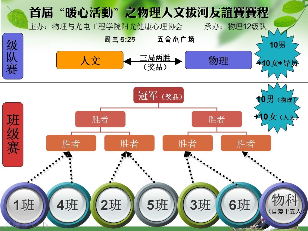新学期伊始,为了增进物理学子与其他学院同学的互通与交流,物理与光电工程学院阳光心协“暖心”系列活动敲响战鼓,3月12号清晨6点30分,“暖心”活动之拔河友谊赛在5舍小广场。华体会(中国)和人文学部的全体12级同学都参加了活动,物理心协的指导老师纪丹红老师和人文2012级队的李文超辅导员老师也到场亲身参与了活动。