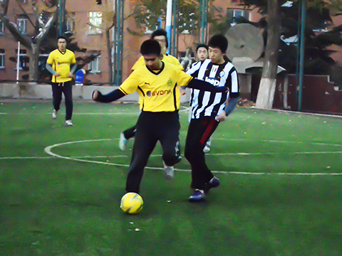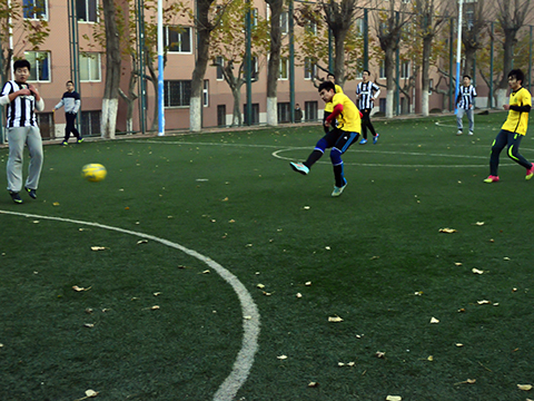 伴随着裁判的一声哨响,比赛正式开始。双方队员随即展开了激烈的角逐。你拼我抢,过人,射门,一系列精彩的动作直让观众欢呼。精彩的传球、绝佳的配合、坚固的防守,无一不体现出了此次比赛队员拼搏的精神。上半场比赛中,物理的队员们凭借着队友之间的默契,最终以4:1轻松结束了上半场的比赛。中场稍事休息。此间,球队的一些老队员们纷纷传授自己的经验。打法,阵型等要点在老队员的指点下边的清晰起来。