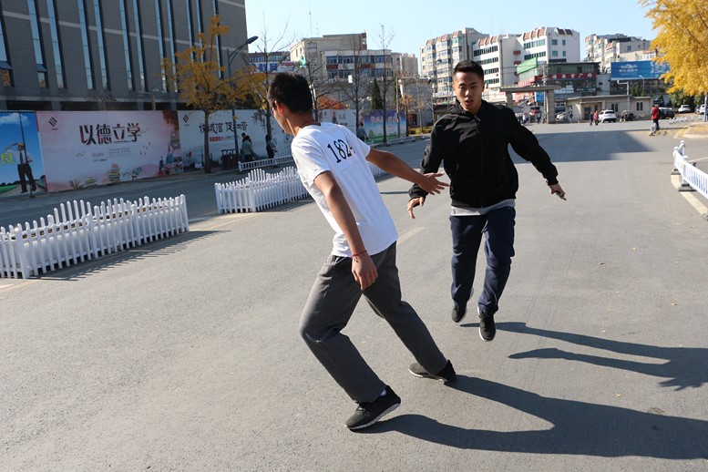 赛制为班级一女四男接力跑,比赛过程中由志愿者骑自行车领路,沿途设有路标站点。一切准备就绪后,各班女生首跑,可谓是巾帼不让须眉,每个人都全力以赴,跑出了自己的水平,而男生的竞争更为激烈,在各班加油助威声下你追我赶,互有领先。