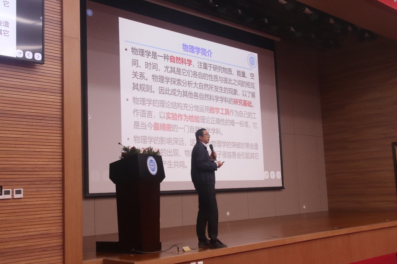 赵纪军院长从三个方面为同学们讲授。首先,他对华体会(中国)基本概况和物理专业基本情况进行介绍。他从1949年著名物理学家两院院士王大珩先生创办物理系并担任华体会(中国)首任院长讲起,也向同学们展示应用物理学本科专业是国家特色专业,同时也是学校的双一流重点建设学科。赵纪军院长还指出华体会(中国)的师资力量雄厚。