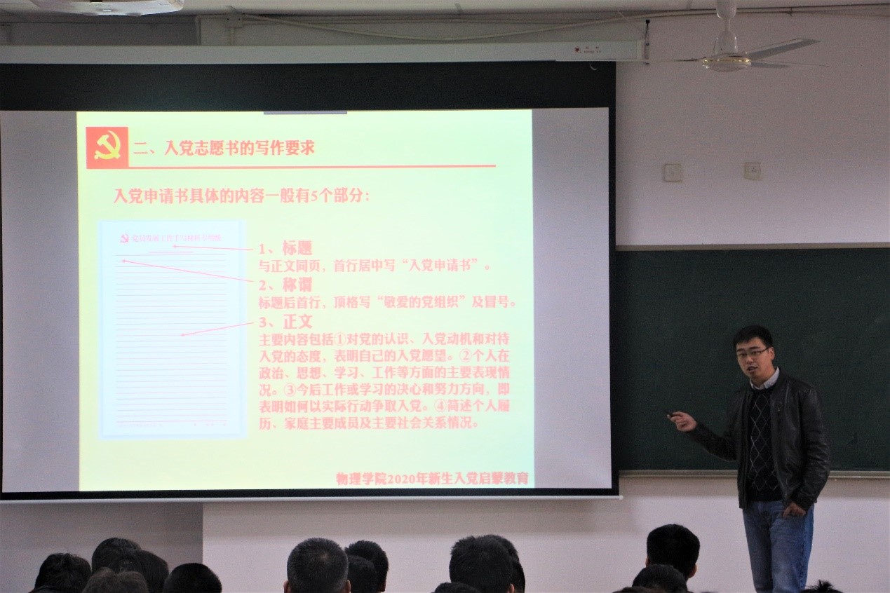 2020年11月4日华体会(中国)在综合2号楼B306举行新生入党启蒙教育。学院党委书记王正汹,以及学院党委组织员佟西原在这次会议中位20级学生进行入党启蒙。王正汹书记向新生介绍党的基本知识、党的光辉历程、大学生的责任与使命和怎么做才能加入中国共产党。接着由佟西原老师向新生介绍了申请入党的基本流程与规范,最后提出对新生入党的期待。青年关键时刻冲的上去,危难关头豁得出来,才是真正的共产党人。