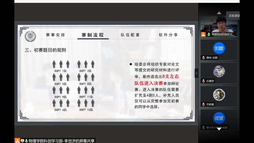 首先,刘政和以自己参赛的PPT为例,为大家讲解如何做好一道题,为参赛选手提供参加比赛的思路与建议。接着,毕研晨从国赛的角度为大家讲述自己参加比赛的一些心得,重点介绍如何查找文献、阅读文献并得到自己想要的内容。最后,李世济为参赛队员讲解DUPT的赛制流程以及向同学们介绍如何组队,并且在科研软件方面还进行一些推荐。
