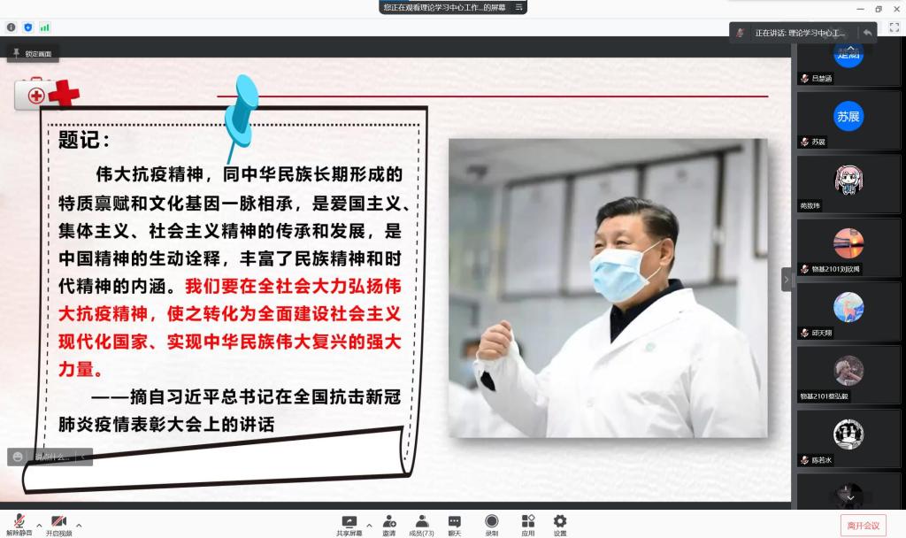 接下来,来自理论宣传中心的刘泽璇同学为同学们进行了抗疫精神宣传讲解。刘泽璇同学分别为我们讲解生命至上,举国同心,舍生忘死,命运与共,尊重科学共五点抗疫精神。带领同学们回顾了自疫情爆发以来中国在抗疫方面取得的重大成就,并重温了抗击疫情中的温暖故事和伟大人物,生动形象地诠释出了中国抗疫精神。