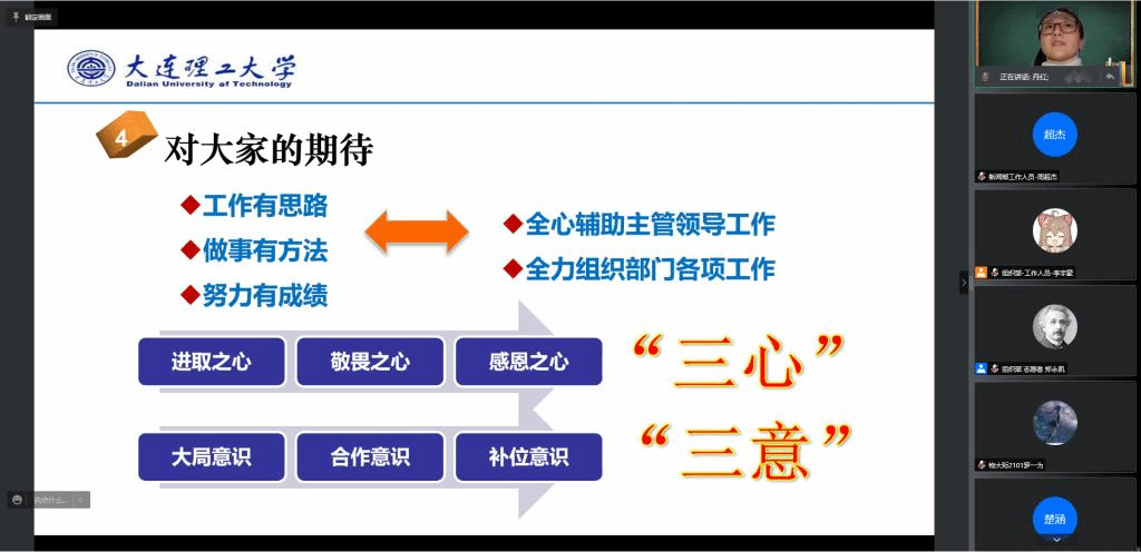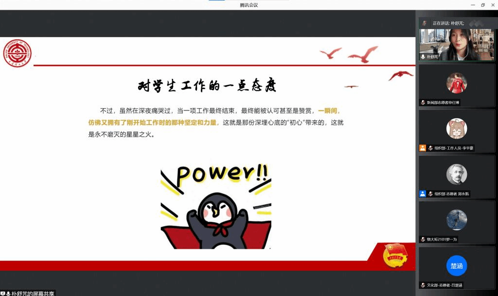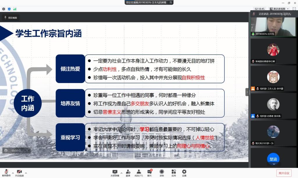 四位优秀的学长学姐对学生工作的各个方面进行经验分享,熊天成同学从经济学的角度向同学们阐述了进行学生工作时应该持有的态度和采用的方法。朴舒梵同学从新闻写作方法、排版、素材、构思等方面向同学们介绍了新闻写作规范和新媒体运营的方法。吴海欣同学为同学们讲解了在学生工作中常用的公文知识、公文写作基本规范,帮助同学们大致了解公文的相关知识。最后,汪不凡同学讲述学生工作的内涵是全心全意为同学服务,应杜绝官僚主义,形式主义,不应带有目的性地去参加学生工作。相信他们的分享可以帮助同学们解决学生工作中常见问题,激励大家努力做好自己的工作。