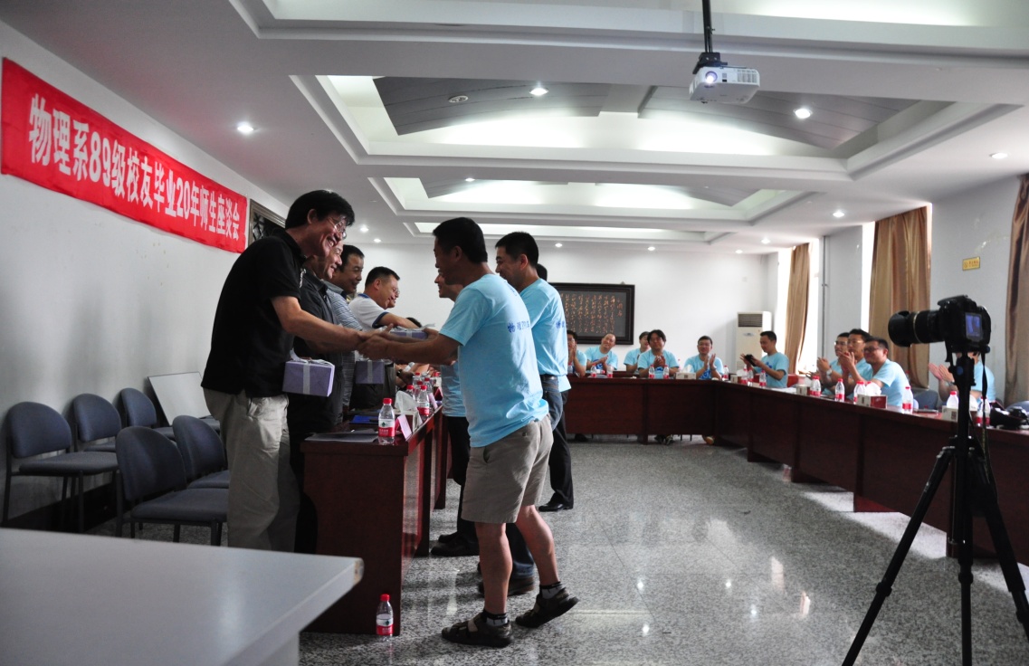 恳谈会由89级1班曾经的团支部书记解春禹主持,作为开场白,老支书与老班长共同发表了热情洋溢、声情并茂的返校感言。物理与光电工程学院院长赵明山教授代表全院师生对89级校友重返母校表示热烈欢迎,并向校友详细地介绍了学院和母校20年来取得的成绩。会上,现任北京创意博科技能源有限公司董事长的原班长邹怀松作为校友代表发言,对学校和学院的培养以及对本次返校活动的大力支持表示由衷感谢;同时,他宣布由物理89级全体校友共同设立了“物理89级校友基金”,主要面向物理与光电工程学院的优秀学生标兵设立专项奖学金,并对学院的物理嘉年华文化品牌活动予以支持,本次捐赠金额10万元。会上,翟刚军老师代表大连理工大学教育发展基金会接受了校友的捐助。