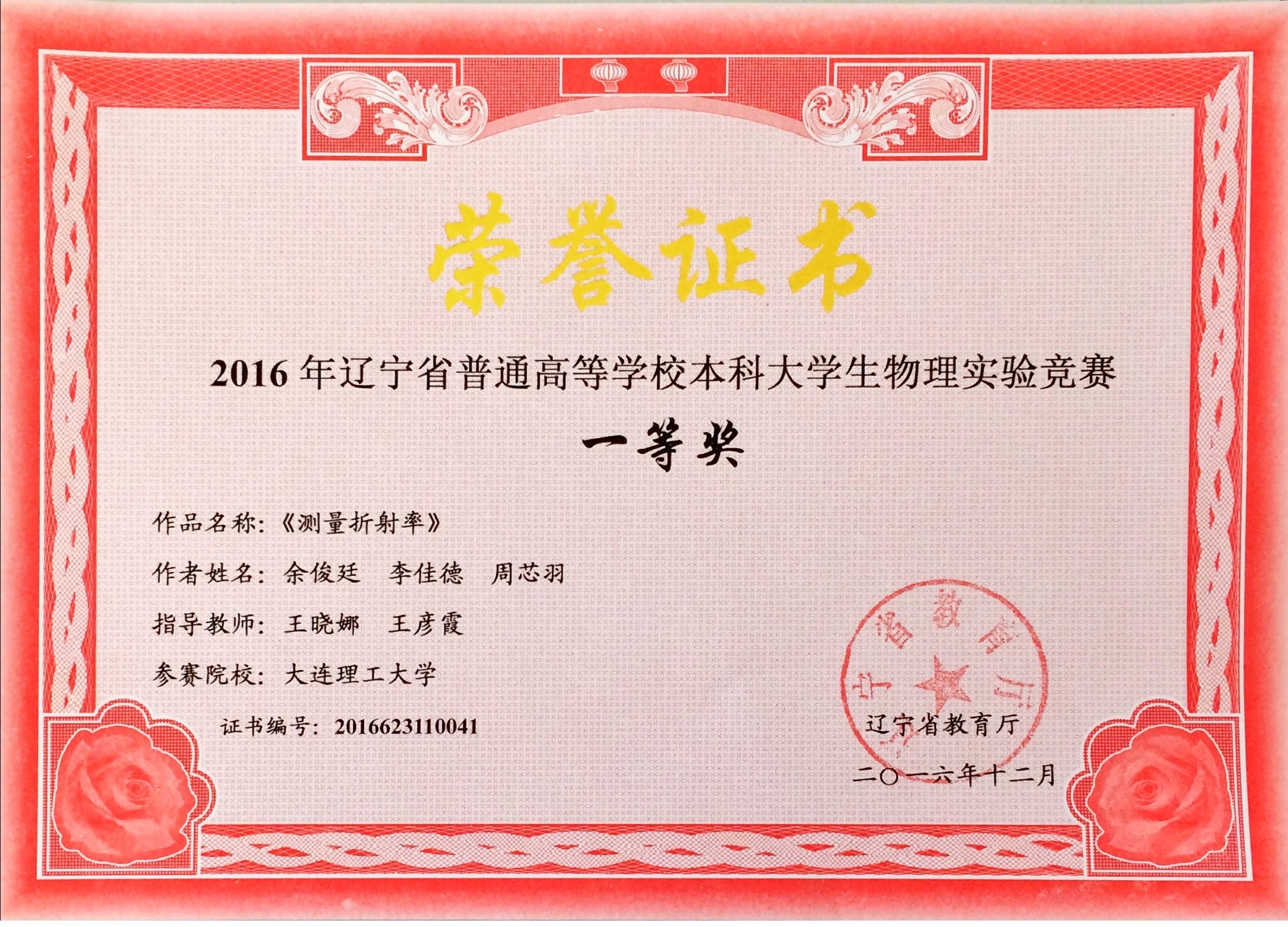 2016年辽宁省普通高等学校本科大学生物理实验竞赛一等奖